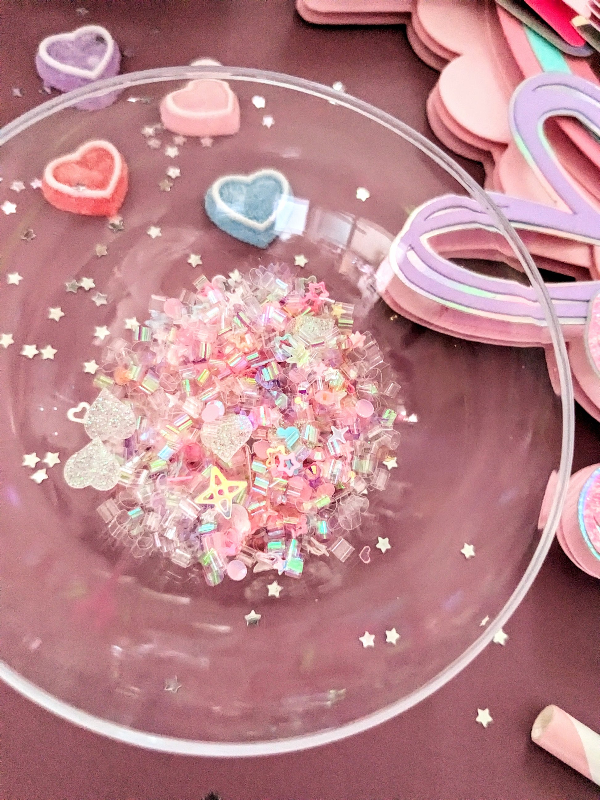 Color mix: iridescent stars, clear and pink bingsu beads, glitter iridescent hearts, bright hallow stars, silver metallic stars